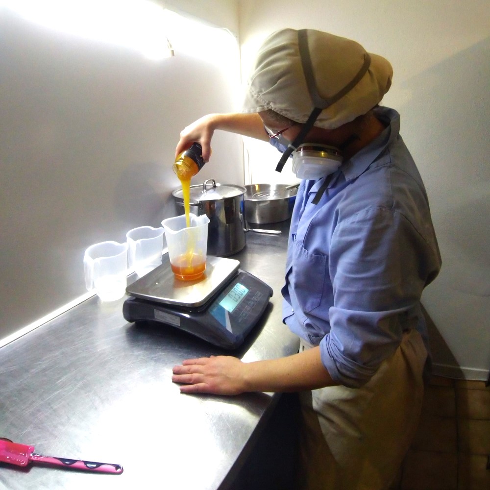 J’utilise la méthode de saponification à froid car elle consomme très peu d’énergie : pas besoin de chauffer les ingrédients, la soude transforme les huiles par simple réaction chimique.